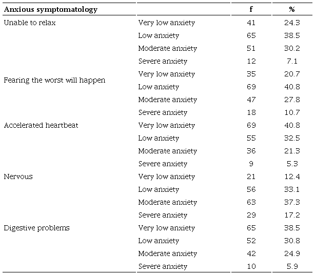 Regarding the anxiety variable, it was found that only 27.2% show a moderate level, while 62.7% of those surveyed show a very low level of anxiety. Of the 21 items that comprise the BAI, a significant increase is observed in 3 items related to anxious symptomatology, which are “Nervous” with 37.3%, “With digestive problems” with 24.9%, and “Being unable to relax” with 30.2% (Table 4).