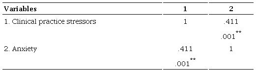 Results: 57.4% reported a medium level of stress and 62.7% a low level of anxiety; however, there are stressors from clinical practice that lead to increased anxiety. A statistically significant positive correlation was found between the study variables (r = .411, p<.001).