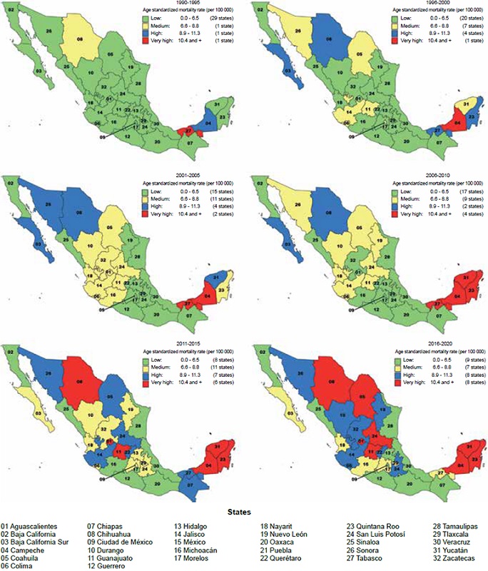 To prepare the thematic maps of suicide mortality rates, the period of study from 1990 to 2020 was divided into six five-year periods, except for the first period covering six years. Mortality rates were grouped into four categories, using the quartiles of the distribution of suicide mortality in the states during the last five-year period (2016-2020) as criteria, so that the most recent five-year period served as a benchmark: low mortality (.0-6.5 per 100,000 population); average mortality (6.6-8.8 per 100,000 population); high mortality (8.9-11.3 per 100,000 population); and very high mortality (for states with mortality rates of 11.4 or more per 100,000 population). Using this uniform criterion in the six periods made it possible to observe how the geographical distribution of suicide mortality rates in young people changes over time. It was therefore possible to visualize the evolution of suicide mortality in young people ages 15 and 29 in every state in the country using the QGIS mapmaking software version 3.4 (QGIS Developer Team, 2019).