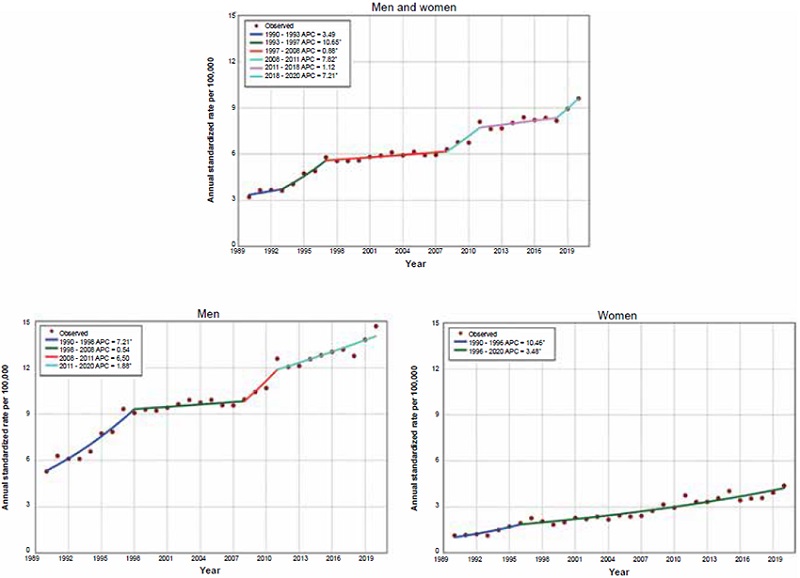 The regression model showed six time segments in suicide mortality rates in young people, all of which increased. The first was from 1990 to 1993 (APC = 3.49); the second from 1993 to 1997 (APC = 10.65); the third from 2007 to 2008 (APC = .88); the fourth, from 1998 to 2011 (APC = 7.82); the fifth from 2011 to 2018 (APC = 1.12); and the sixth from 2018 to 2020 (APC = 7.21). The analysis of mortality rates throughout the period showed a significant upward trend (AAPC = 3.6; 95% CI [2.4, 4.7] p < .001), reflecting the increase from 3.2 to 9.6 deaths/100,000 young people between 1990 and 2020 (Figure 2).