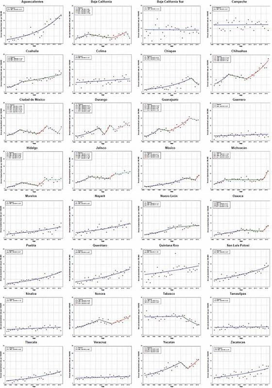 The Joinpoint segmented regression model was used for the time analysis of suicide mortality. Based on a log-linear model, it identifies the points where the direction or magnitude of the trend changes significantly, to determine whether a multisegmented line is statistically more useful for describing the time evolution of a set of data than a straight or less segmented line (Kim, Luo, Kim, Chen, & Feuer, 2014; Kim, Fay, Feuer, & Midthune, 2000). This model makes it possible to detect the points where significant changes occur in mortality trends (in other words, whether they remain stable, or increase or decrease) and also estimates the APC and AAPC (Annual Percentage Change and Average Annual Percentage Change) for each segment of the linear regression and the entire time series respectively as well as their 95% confidence intervals and level of significance (Torres-Sánchez, Rojas-Martínez, Escamilla-Núñez, de la Vara-Salazar, & Lazcano-Ponce, 2014). To select the model with the best data fit, the method using the sequence of permutation tests was used to guarantee that the approximate likelihood of a Type I error would be less than .05. This method involves conducting several tests to choose the number of points of union, using the Bonferroni correction for multiple tests (Kim et al., 2000). The analyses were conducted using Joinpoint v. 4.5.0.1 regression software (National Cancer Institute, 2016). For its graphic representation, the same mortality scale was used (with a rate of 0 to 15 deaths per sex and 0 to 25 deaths per 100,00 for the states).