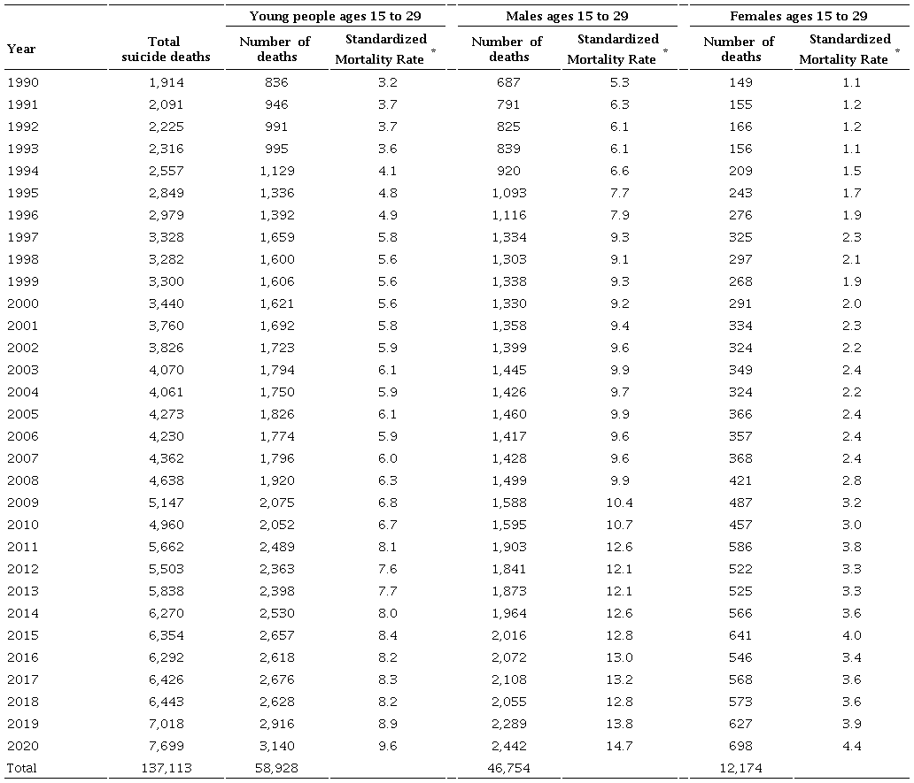 Young people ages 15 to 29 who died by suicide from 1990 to 2020, primarily resident in Mexico. This period was chosen because of the availability of official information on deaths registered in Mexico, whose annual databases can be downloaded from the INEGI website (Instituto Nacional de Estadística y Geografía[INEGI], 2022a). Deaths by suicide in the period 1990-1997 were identified using codes E950-E959 of the 9th revision of the International Classification of Diseases (ICD; Pan American Health Organization[PAHO], 1975). As of 1998, when the 10th revision of the ICD began to be used in Mexico, they were identified with codes X60-X84 (PAHO, 1995).