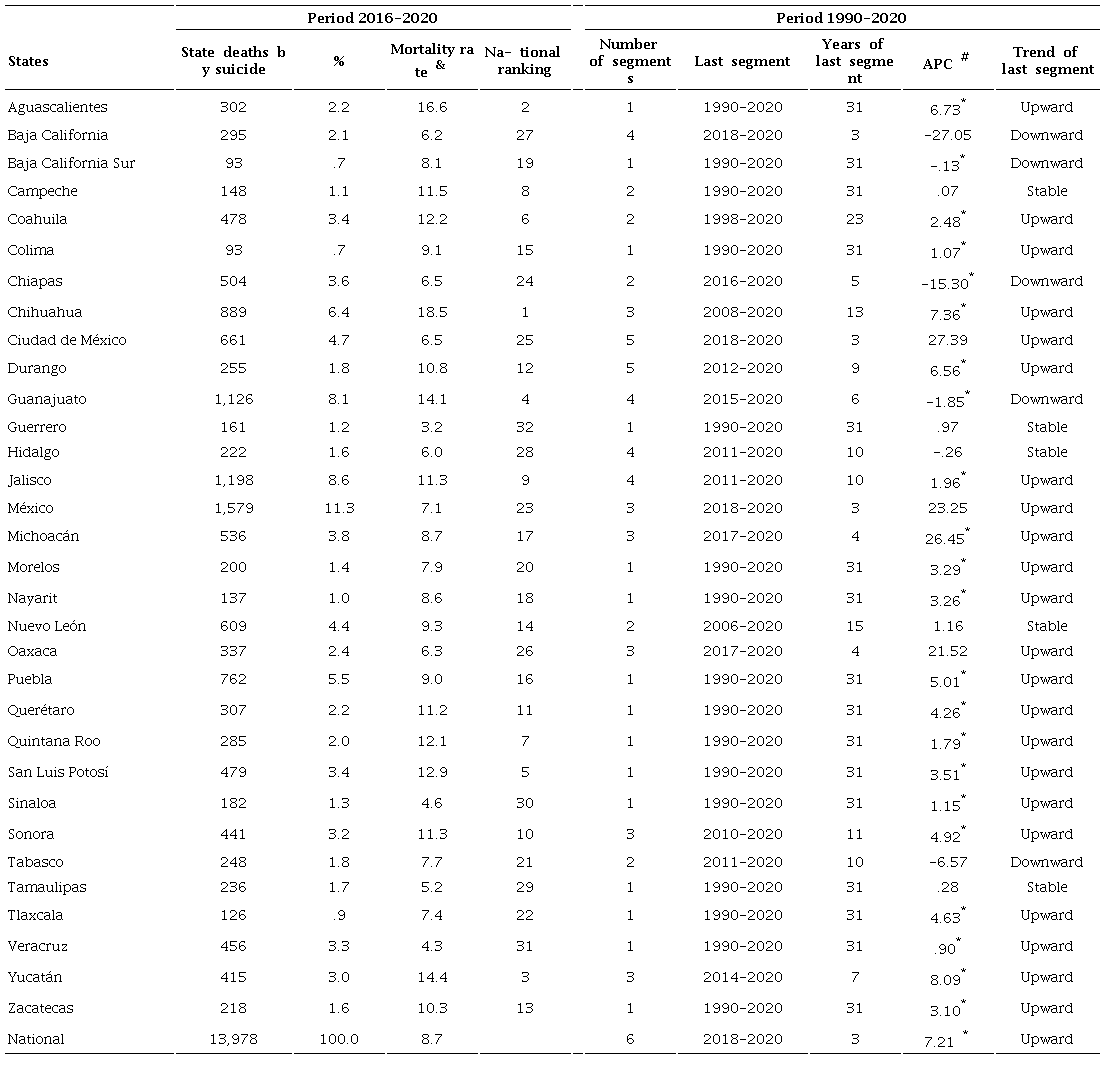Method: Descriptive, ecological time-series study, based on official information. Standardized mortality rates were calculated using information on deaths (INEGI) and population estimates (CONAPO). The magnitude, distribution, and patterns of suicide mortality at the national level and by state were analyzed using the Joinpoint segmented regression model.