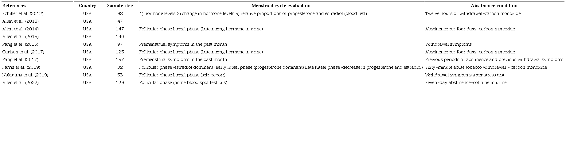 The authors included studies that compared the phases of the menstrual cycle, and hormone levels or evaluated the relationship between premenstrual syndrome and a withdrawal condition. Randomized and non-randomized clinical trials and randomized controlled trials were considered. Studies were included when the samples comprised women ages 18 to 40, with regular menstrual cycles, who had smoked regularly in the past two years.