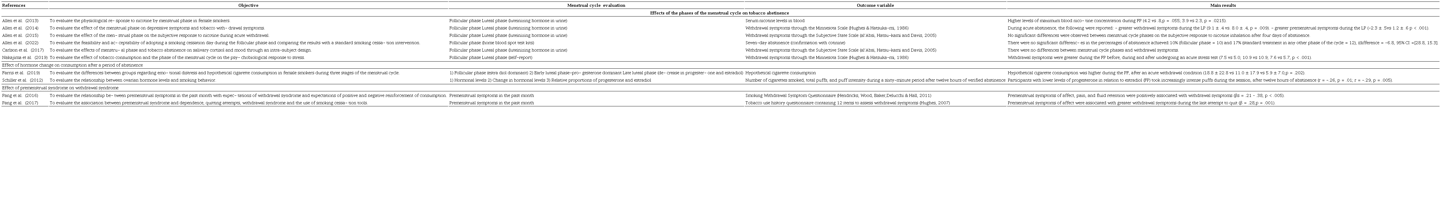 Method: A literature search was conducted in Scopus, PubMed, MEDLINE, and PsycINFO databases. Ten articles comparing the phases of the menstrual cycle or analyzing the association between premenstrual syndrome and a withdrawal condition (length of abstinence or withdrawal symptoms) were included.
