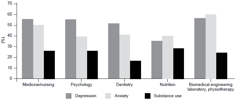 Conversely, the frequency of substance use was similar to that reported in studies evaluating the general population (Ekström et al., 2022) and health personnel in contact with infected patients (Bryant-Genevier et al., 2021). Although no significant differences were found in the frequency of depression, anxiety and substance use among students from different majors, the present results can be contrasted with those of studies and meta-analyses previously reported. For example, 40% of dentistry participants obtained GAD-7 scale scores over 10 points, higher than the figure reported in a meta-analysis showing a global prevalence of 35%. Moreover, figures were lower in studies conducted in European than Latin American countries (Lasheras et al., 2020). The present results contrast with those of the study conducted in Germany by Guse et al. (2021) comparing the frequency of stress, depression and anxiety among first-year medicine and dentistry students, showing that the latter had a higher frequency of stress, a difference they attributed to the curricula of each major.