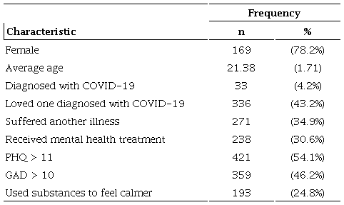 A total of 4.2% of the participants reported having been diagnosed with COVID-19, 43.2% reported that a loved one had been diagnosed with it, 34.9% presented with another illness apart from COVID-19 and 30.6% had been treated by a psychologist or psychiatrist in the past six months. Participants reported increased stress due to having a loved one with COVID-19, not seeing their friends, and financial problems in the family. The evaluation of psychopathology found that 421 subjects (54.1%) obtained a PHQ score ≥ 11, suggesting moderate to severe depression; 359 (46.2%) obtained a GAD score ≥ 10, suggesting generalized anxiety, while 193 subjects (24.8%) reported using substances to feel calmer. Table 1 shows the sample characteristics and the frequency of the stressors examined.