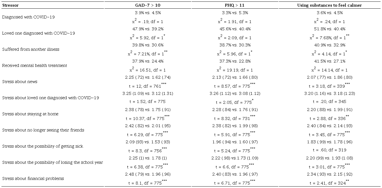 Participants who obtained scores on the scales above their cut-off point and reported using substances to feel calmer reported having been treated by a mental health professional more frequently, as well as having experienced more stress (Table 2).