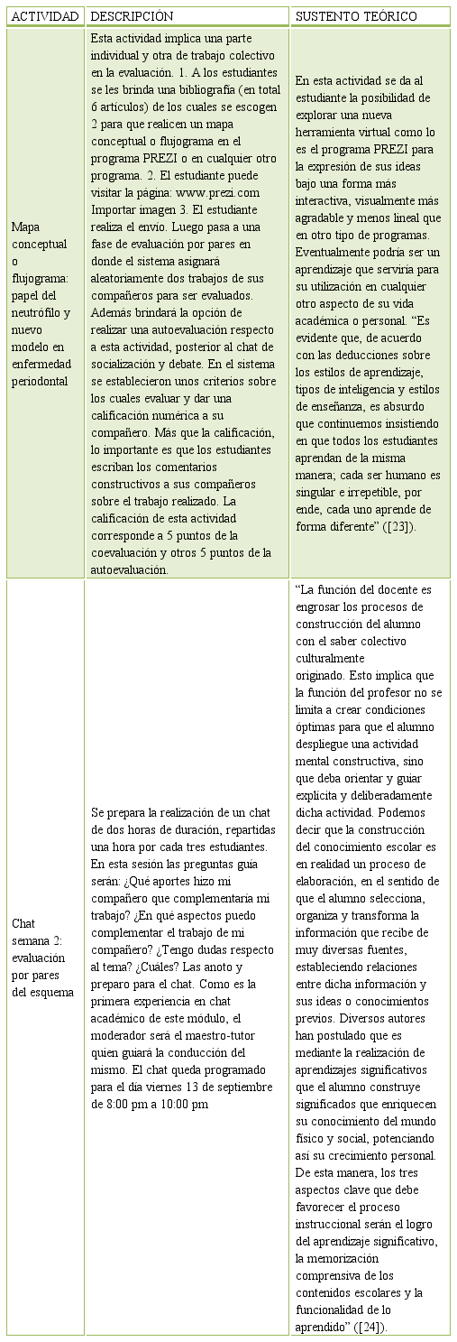 Abstract: Background: the current context presents several possibilities for innovation in the educational field, one of which is the use of Information and Communication Technologies (ICT). In dentistry, the efforts for the introduction of ICT in teaching-learning processes have been progressive and somewhat difficult, due to the characteristics of the discipline that requires pre-clinical practices and with patients. However, the myriad of tools offered by ICT have made them more attractive, versatile and useful for strengthening educational processes in complex areas. In the area of periodontics there is a difficulty for the learning of Immunology in Periodontal Disease due to the number of hours dedicated and its complexity. Objective: to design and implement a didactic proposal through virtual tools to strengthen the learning process regarding immunology in periodontal disease. Materials and methods: pedagogical research of qualitative type framed within Action Research. A platform was developed in Moodle with five modules, each one with cognitive, procedural and attitudinal objectives; as well as the approach of activities that strengthened the student's learning and an evaluation process in which both the tutor and the student are an active part, giving rise to a procedural evaluation. Discussion and conclusion: although the development of this type of proposal is constantly redefined in practice, as an initial exercise it is useful to show a useful strategy in dentistry that would eventually yield satisfactory results for the strengthening of learning processes in those subjects that present greater difficulty.