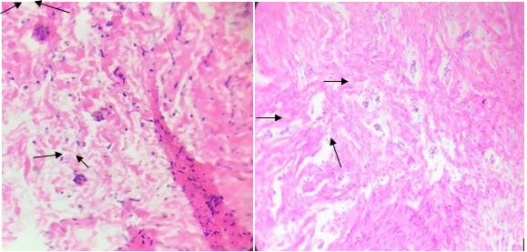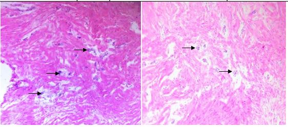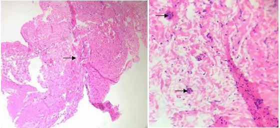 Posteriormente, se obtuvieron los bloques de parafina a los cuales se les realizó coloración de hematoxilina-eosina; las láminas obtenidas en cada caso fueron interpretadas por dos patólogos, uno general y uno oral (CP), quienes generaron los diagnósticos y el informe correspondiente. En las descripciones microscópicas de los reportes de patología se tuvieron en cuenta los siguientes hallazgos histopatológicos: tipo de epitelio, estroma fibrohialinizado, estroma fibrolaxo, infiltrado inflamatorio mononuclear crónico, infiltrado inflamatorio mixto, restos epiteliales odontogénicos, calcificaciones dentales, trabéculas óseas desvitalizadas, trabéculas óseas con histología usual, hemorragia, colonias bacterianas, entre otros. Se precisa que en las presentes descripciones se aclaró si los hallazgos se encontraban presentes o ausentes.
