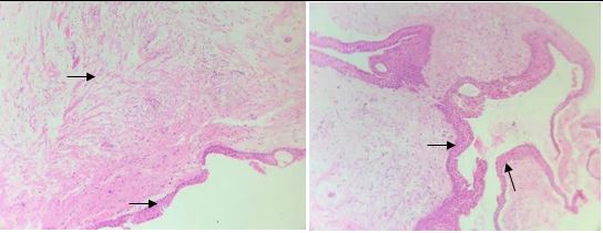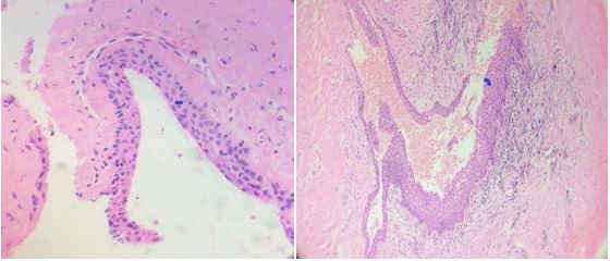 Se observa pared quística revestida de epitelio escamoso aplanado, estroma subepitelial fibrohialinizado con leve infiltrado inflamatorio mononuclear y escasos restos epiteliales odontogénicos