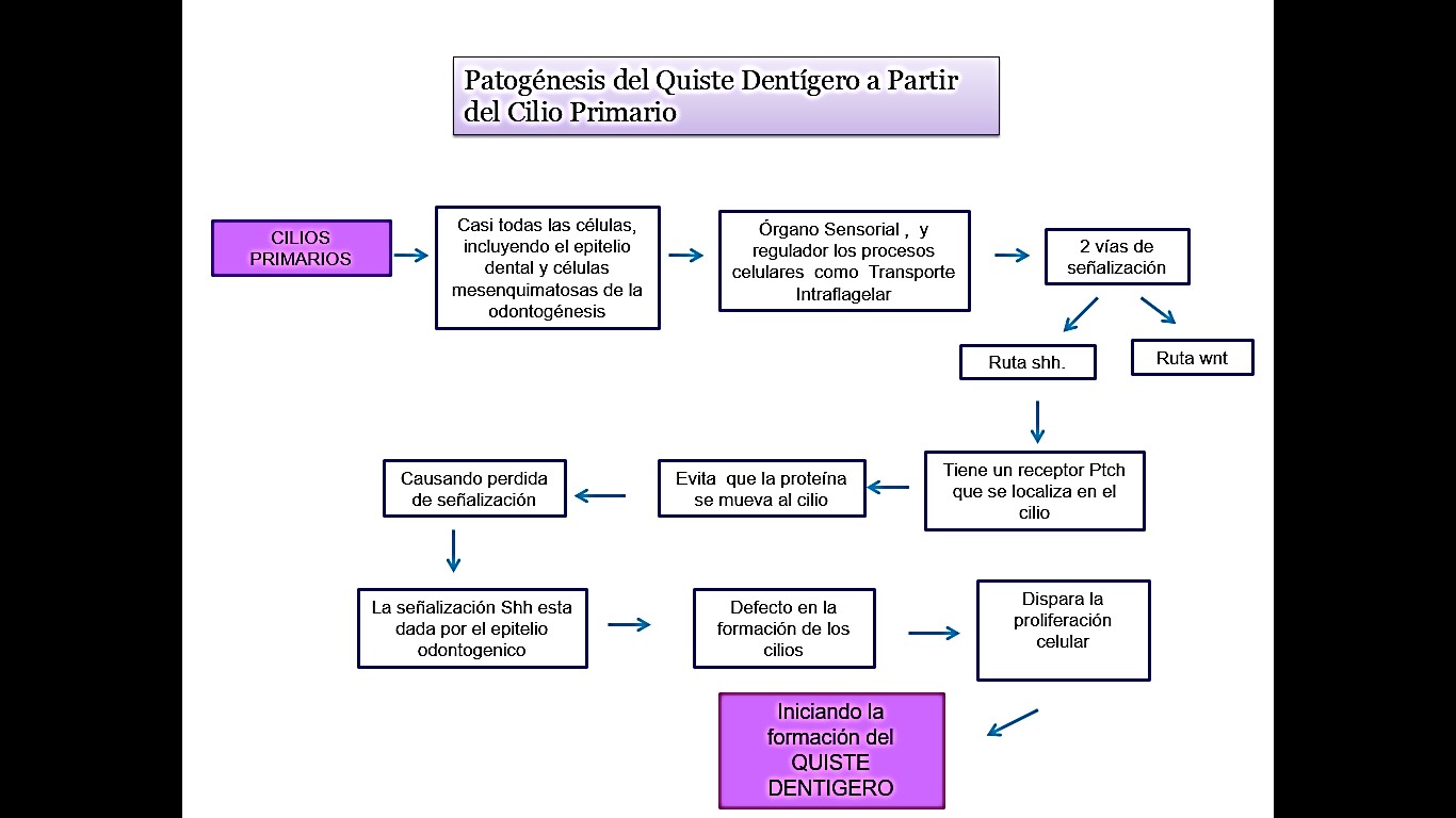 Elaboración propiaLa patogénesis del quiste dentígero es controversial. La literatura estudiada alrededor del tema propone que ocurren eventos similares a la enfermedad renal poliquística autosómica dominante que tiene como característica inducir la formación de múltiples quistes en los riñones, debido a una alteración en los cilios primarios. Un cilio primario se caracteriza por ser el centro de señalización de la célula epitelial, que participa en la regularización del ciclo celular y la organización del citoesqueleto. Una de sus funciones es ser mecanoreceptor de las proteínas Pc1 y Pc2. En relación a la formación del quiste dentígero, esto se debe específicamente a la inactivación del gen Ptch (Patched), y los señaladores Shh (Sonic Hedgehog). Sobre los cilios, es importante mencionar que estos se encuentran en casi todas las células epiteliales del cuerpo humano incluyendo el epitelio odontogénico, que se encarga de la señalización Shh; cuando se presenta una alteración en esta ruta el receptor Ptch se ve afectado y pasa a un estado de inactividad que induce la proliferación celular lo que lleva a la formación del quiste dentígero (15), (Figura 3).