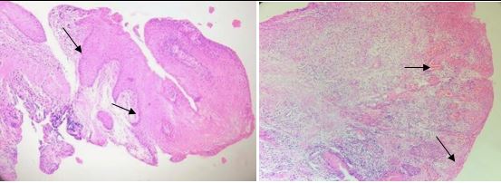 D: Caso No. 14.1. Se observa pared quística revestida parcialmente por epitelio escamoso estratificado acantósico con prolongación de clavos epiteliales. Estroma subepitelial fibrohemorrágico con severo infiltrado inflamatorio mixto predominantemente mononuclear y espículas óseas desvitalizadas. Diagnóstico: Quiste folicular inflamatorio/ Quiste dentígero inflamatorio