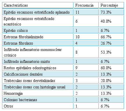 En cuanto a los hallazgos histológicos obtenidos se encontró que el epitelio más frecuente fue el escamoso estratificado aplanado en un 73.3%, seguido del escamoso estratificado acantósico en un 40%. El estroma fibrohialinizado fue el de mayor prevalencia con un 66.7%, mientras que el estroma fibrolaxo se encontró en un 26.7%. A su vez, se evidenció infiltrado inflamatorio mononuclear crónico en un 53.3% e infiltrado inflamatorio mixto en un 6.7%. Se evidenciaron restos epiteliales odontogénicos en un 60% de las biopsias, mientras que las calcificaciones dentales estuvieron presentes en un 13.3%. Las trabéculas óseas de tipo desvitalizadas se hallaron en un 20%, entretanto, las de histología usual se hallaron en un 13.3%. Además, se encontró hemorragia en el 13.3% de los casos y, colonias bacterianas en el 6.7% (ver Tabla 1).