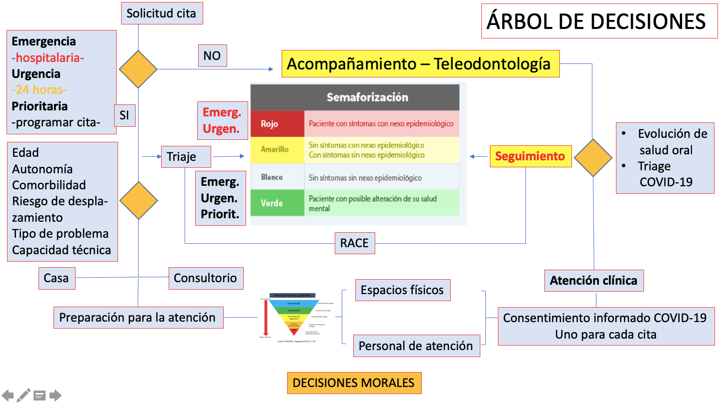 Ante este panorama, y en todos los casos, se plantea la necesidad de tomar decisiones morales (8). Como personal de salud, los odontólogos tenemos la obligación moral de cuidar la vida de nuestros pacientes, personal auxiliar y sus familias. Esto debe llevar al odontólogo a reflexionar sobre el tipo y grado de riesgo que es aceptable correr por parte del equipo humano odontológico durante esta pandemia, con el fin de adoptar y aplicar el principio universal de la precaución. De esta manera, será factible disminuir el riesgo de infecciones cruzadas, atendiendo en estos momentos solo aquellos eventos que son inaplazables, dado que no es posible saber en todos los casos, si un paciente es o no un transmisor potencial al ser portador asintomático o presentar síntomas menores. Ello no significa que en los casos en los que consideremos necesaria la atención y el paciente se desplace al consultorio, no debamos realizar todos aquellos procedimientos que contribuyan a estabilizar en el tiempo la salud bucal de esa persona.
