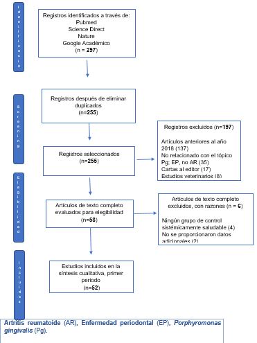 La búsqueda se basó en ensayos clínicos, estudios descriptivos, revisiones sistemáticas, tesis y revisiones de la literatura. Se incluyeron artículos que identificaron la presencia de Porphyromonas gingivalis, su biología molecular, patogénesis y pacientes diagnosticados con AR.