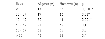 Con el uso de la prueba U de Mann Whitney se encontraron diferencias estadísticamente significativas en el promedio de edad entre los pacientes que tienen valores de TA ≥140/90 mm Hg y los que tienen valores de TA <140/90, para ambos sexos. La edad promedio para presentar la posible condición de HTA en los hombres fue de 52 años, IC95% (50 - 54); (p = 0,000001), y en las mujeres de 55, IC95% (53,5 - 56,5); la edad promedio en la cual los pacientes no presentaron la condición de HTA fue de 43,3 IC95% (41,6 - 44,3) y 43,1 IC95% (42,2 - 43,74), respectivamente.