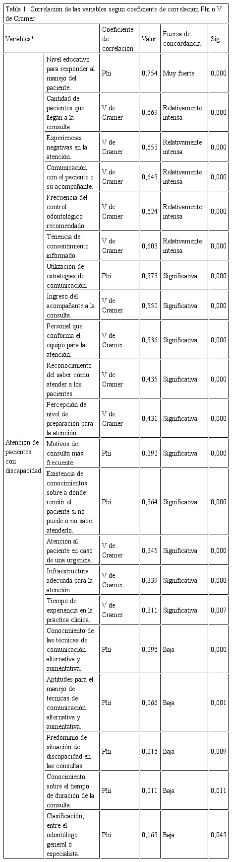 Por medio de un análisis bivariado se analizó el nivel de covarianza entre atender pacientes con discapacidad y las demás variables del estudio. Esto con el fin de encontrar la fuerza de concordancia y significancia estadística para identificar las variables que estaban relacionadas con mayor fortaleza y someterlas a un análisis multivariado, y con ello lograr identificar los factores determinantes en la atención de pacientes con discapacidad por parte del odontólogo (Tabla 1).