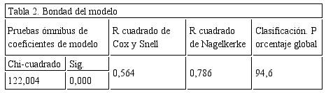 El modelo es significativo en la medida que explica entre el 0,564 y el 0,786 de la variable dependiente y se clasifican correctamente el 94,6% de los casos; en razón de esto, se aceptó el modelo.