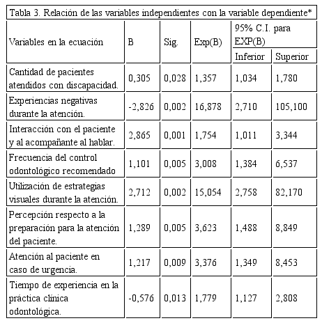 De acuerdo con los datos analizados los odontólogos que atienden PCD son los que mayor cantidad de pacientes han atendido, saben que deben dirigirse al paciente y al acompañante en caso de estar presente y que la frecuencia de citas para control debe ser cada 3 meses. En ese sentido, utilizan estrategias visuales para la atención, brindan atención en caso de presentarse una urgencia odontológica, han tenido menos experiencias negativas y tienen menos años de experiencia en la práctica clínica odontológica. En resumen, de todas las variables seleccionadas aquí, aquella que tiene una mayor fortaleza para explicar el evento de atender pacientes con discapacidad es la relacionada con experiencias negativas durante la atención (mayor exponencial de b –Exp(b)-).