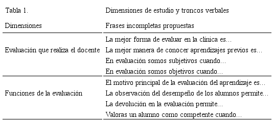 Dichas frases consisten en un conjunto de «troncos verbales» que los opinantes, al completar, estructuran desde sus ideas, valores, creencias y dudas, con la finalidad de expresar qué piensan respecto a cada uno de los aspectos propuestos, de manera abierta y usando sus propias expresiones (29). Es este estudio se asumió que la libertad que suponían las respuestas proporcionaría información espontánea de los docentes participantes. Así, todas las frases fueron relativas a la naturaleza de la evaluación del aprendizaje y se agruparon en dos dimensiones con cuatro frases incompletas, cada una de ellas (Tabla 1). Para completarlas, se les indicó a los docentes que fuese con una o más palabras, considerando lo primero que les hiciera sentir o pensar, y que no tomaran mucho tiempo en responder.