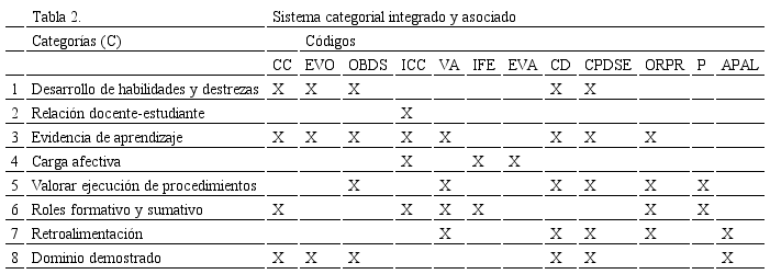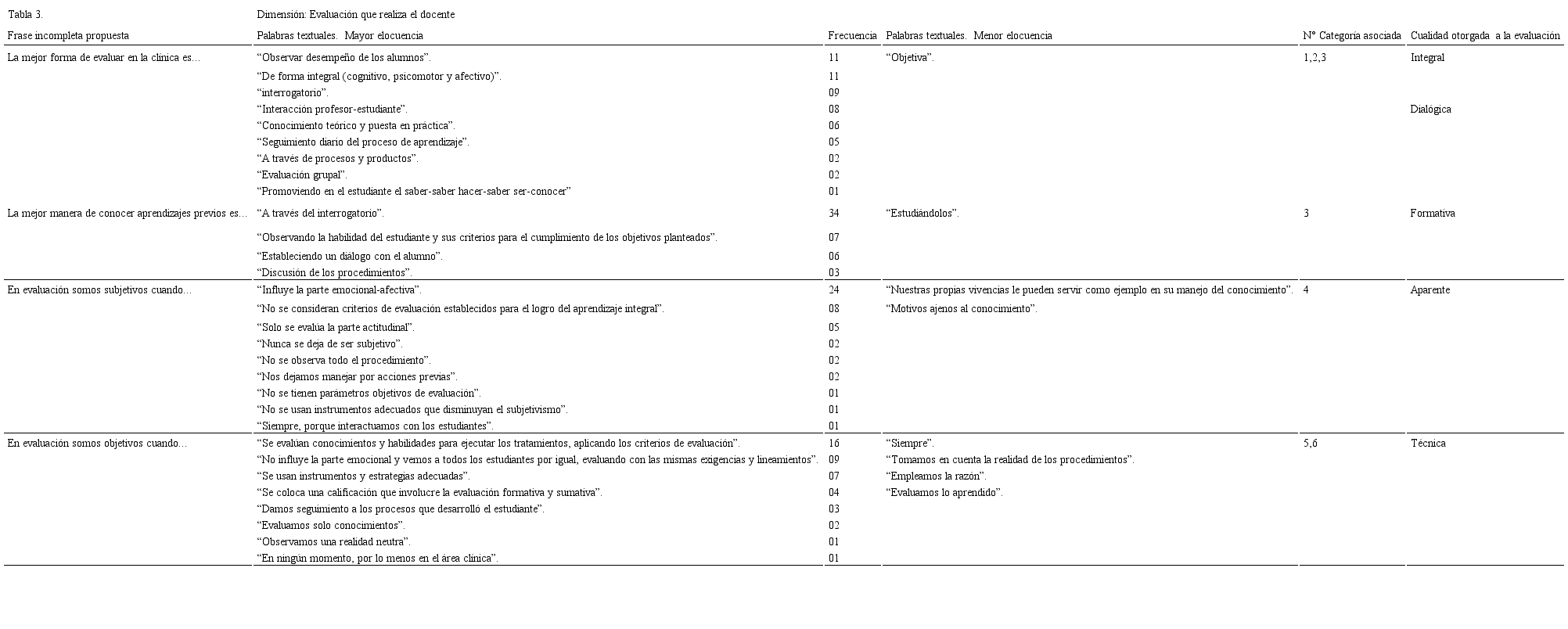 Conforme a estos resultados, se expresa que las creencias sobre la evaluación del aprendizaje que realiza el docente en espacios formativos clínico-odontológicos descansan en la evaluación oral como estrategia por excelencia, para conocer aprendizajes previos del alumno y valorar su capacidad para ejecutar algún tratamiento. Aquí, el énfasis se sitúa en evidencias de aprendizajes, para lo cual es básico observar el desempeño del estudiante en constante interacción bidireccional y sus intenciones al integrar aspectos cognitivos, psicomotores y actitudinales. En este aspecto se aplican criterios de evaluación con marcada influencia emocional y afectiva.