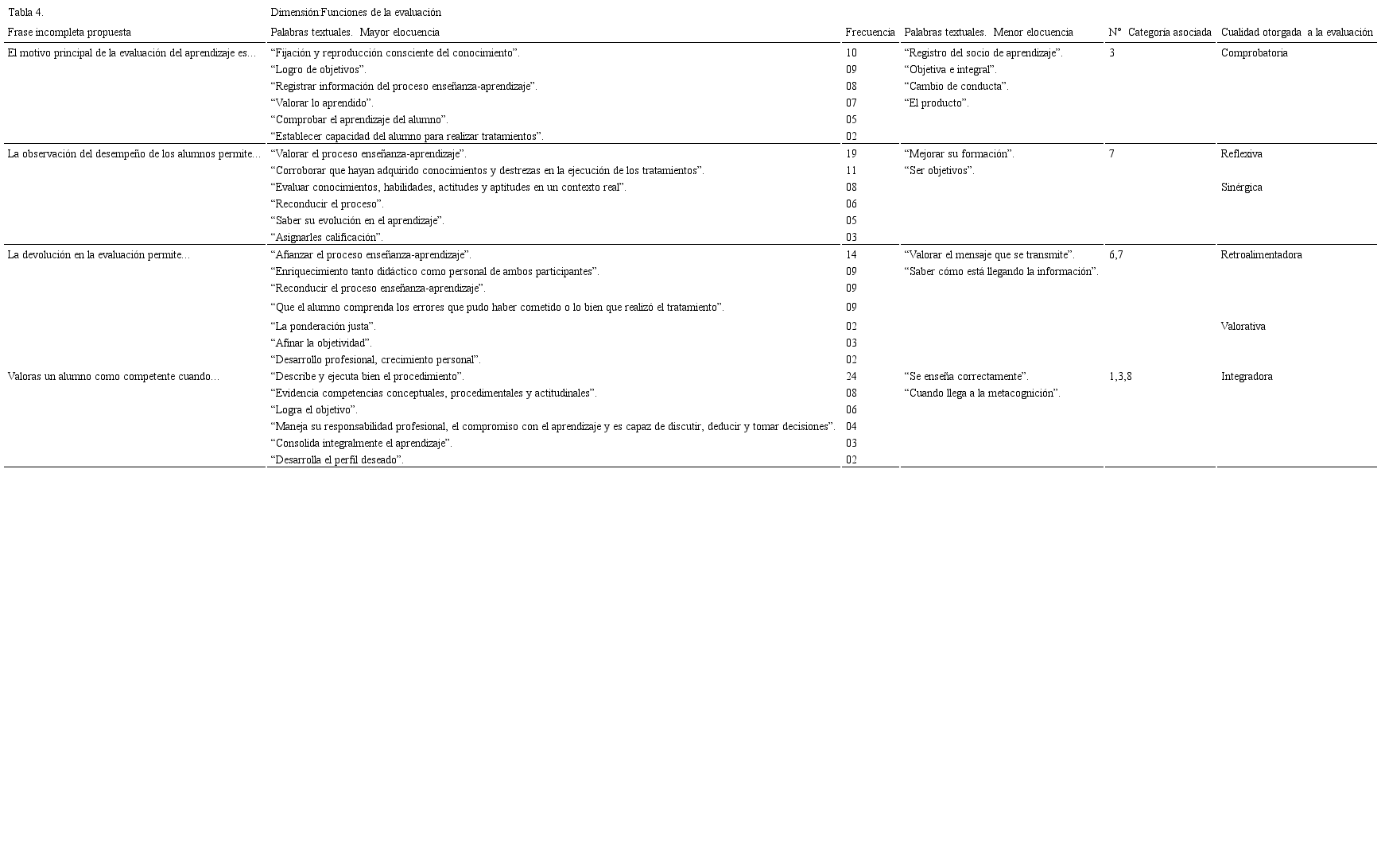 En cuanto a las funciones de la evaluación, la Tabla 4 muestra las diversas respuestas agrupadas alrededor de este tema. Una primera función, la comprobatoria, emergió en el sentido de demostrar o confirmar logros, como evidencias del aprendizaje estudiantil (C3). Esta se encuentra basada en la valoración del proceso enseñanza-aprendizaje, la construcción de conocimientos y la comprobación del desempeño estudiantil.