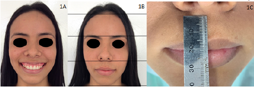 A 20-year-old female patient attended the School of Dentistry, University of Cartagena, Colombia, for presenting aesthetic dissatisfaction in her smile because of the amount of gum displayed every time she smiled (figure 1A). The patient did not report a previous history of orthodontic or cosmetic dental treatment. No relevant family and personal medical history for the case (ASA I according to American Society of Anesthesiologists), she denied tobacco use. An extraoral and intraoral clinical examination was performed to evaluate the degree of gingival excess that the patient presented and to classify the smile. First, the facial height is evaluated measuring the three-thirds facials to determine bony maxillary excess when the lower third is longer to other two thirds. In this patient, the facial height was normal (figure 1B). The upper lip was measured from the subnasale to the inferior border of it, when it measures 20 mm it is considered within the normal limit, in the patient there was no deficiency in the length of the maxillary lip (figure 1C). It was not necessary to take radiographs or previous tomography scans of patients since the protocol requires them when the patient has excessive maxillary growth and, therefore, to determine if there is a need for orthognathic surgery.