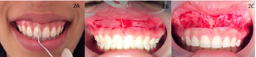 The intraoral examination revealed that there was a high smile with 3 mm to 4 mm of gingival exposure measured with a periodontal probe, with extension of the smile showing up to the first upper molars and normal occlusion, the crowns of the dental organs had an adequate proportion in height and width (figure 2A). According to the clinical examination findings the excessive gingival display was classified with EGD (E) subclass 2. The treatment option presented was the lip stabilization technique or LipStaT..