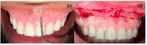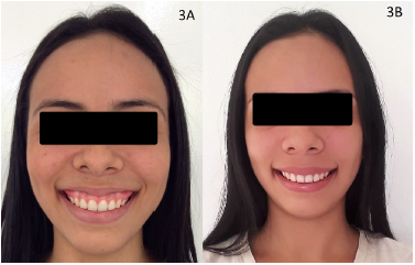 A 31-year-old female patient attended to the School of Dentistry, University of Cartagena, Colombia, for a consultation regarding cosmetic nonconformity due to a gummy smile. The patient reports a previous history of orthodontic treatment, gingival plastic surgery and cosmetic dental treatment. Without relevant family and personal medical history (ASA I according to American Society of Anesthesiologists), no smoker. An extraoral and intraoral clinical examination was performed, the facial height was normal. The upper lip no show deficiency in the length of the maxillary lip. The intraoral examination revealed there is a high smile with 4 mm of gingival exposure (figure 4A). According to the clinical examination the gummy smile was classified as EGD (E) subclass 2.