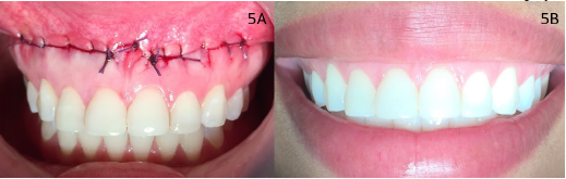 The mucosal flap was advanced and sutured to the edge of the mucogingival line by a continuous suture with polyglycolic acid 4.0 (figure 5A). Postoperative indications included not brushing the area and rinsing with 0.12% chlorhexidine with 0.05% CPC for 10 days, amoxicillin 500 mg, nimesulide 100 mg and Fitoestimoline. (Triticum vulgare oral gel) 3 times a day. Post-surgical controls are performed at 8, 15 and 30 days. The patient presented satisfactory esthetic results with evident reduction of her gingival smile to less than 3 mm (figure 5B).
