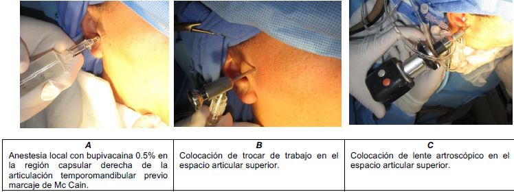 Se decide realizar protocolo completo de artroscopia diagnóstica y exploradora de la articulación temporomandibular de lado derecho, previo consentimiento informado, se recibe en admisión hospitalaria con ayuno completo. Se efectúa, en la sala de observación, un monitoreo no invasivo continuo desde su ingreso a sala de quirófano y se consignan los signos vitales: tensión arterial 128/72 mmHg, frecuencia cardíaca 76 latidos/minuto, frecuencia respiratoria 16 respiraciones/minutos, temperatura 36.4°C, oximetría de pulso 98%.