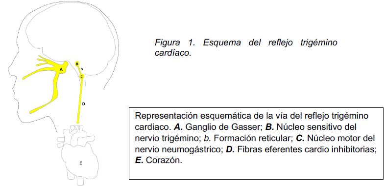 El primer paso en el desarrollo histórico del RTC fue considerado por Joseph Breuer (11) sobre la autorregulación de la respiración a través del nervio vago en 1868, posteriormente Kratschmer (12) mostró el desarrollo súbito de hipotensión, asistolia, arritmia cardíaca e hipermovilidad gástrica en un modelo animal durante la manipulación de la mucosa nasal. La primera descripción, originalmente fue llamada como reflejo óculo cardíaco en 1908 por Bernard Ascher y Guiseppe Dagnini (11). El término “reflejo trigémino cardíaco” fue sugerido por Shelly y Church (13) debido a que, en contraste con el reflejo óculo-cardíaco, la vía nerviosa del RTC involucra las tres ramas del V par craneal (7,11); las terminaciones nerviosas sensitivas del V par craneal envían impulsos a través del ganglio de Gasser hacia su núcleo sensitivo, formando la vía aferente del arco reflejo. Estas neuronas después continúan en la formación reticular para conectar con las fibras de la vía eferente en el núcleo motor del X par craneal, las cuales son cardio inhibitorias, surgiendo y terminando en el miocardio (Figura 1). Así que también el RTC puede ser denominado como “Arco trigémino-vagal” el cual resulta en una disminución de la frecuencia cardíaca (14).