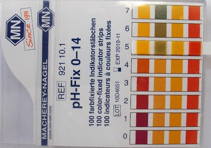 Se inició con un cuestionario de preguntas sobre edad, sexo y procedencia, seguido de un examen clínico, para lo cual se pidió al paciente recostarse sobre el sillón dental y, cumpliendo todas las normas de bioseguridad como el uso de guantes de examinación, gorro, mascarilla, mandil, gafas de protección e instrumental debidamente esterilizado, se procedió con el examen clínico intraoral que incluyó la medición del pH salival por medio de la colocación de tiras reactivas de color de la marca Macherey-Nagel . pH-Fix 0-14 (Figura 1) sobre el dorso de la lengua del paciente por un minuto y en condiciones de ayunas, para ello se solicitó al paciente no ingerir alimentos por lo menos 2 horas antes del procedimiento. Para la determinación del pH se compararon los colores obtenidos en la tira reactiva con los cuatro colores testigo para la medición. Si los colores coincidían, se apuntaba el número registrado en la caja y que correspondía con los colores coincidentes.