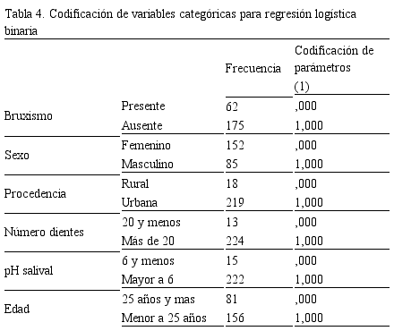 Abstract: Objective: to identify the risk factors of severe dental attrition in patients who attended public and private dental care institutions in the city of Cuenca-Ecuador. Materials and methods: were analyzed 237 adult patients, 79 cases, with dental attrition grades 2, 3 and 4 according to the Smith and Knight index and 158 controls with attrition grades 0 and 1. A clinical and photographic examination was carried out to determine the relationship between dental attrition and factors such as age, sex, origin, number of residual teeth, salivary pH and bruxism. Results: after a bivariate analysis, it was evident that patients older than 25 years (OR = 2.47 CI = 1.41 - 4.35 X2 = 10.21 p = 0.001), with less than 20 teeth in the mouth (OR = 4.95 IC = 1.47 - 16.62 X2 = 7.97 p = 0.004) and with bruxism (OR = 2.64 IC = 1.45 - 4.81 X2 = 10.49 p = 0.001) are more likely to have severe tooth attrition. After a binary logistic regression this relationship was confirmed: patients older than 25 years (OR = 2.03 IC = 1.08 - 3.818) with less than 20 teeth in the mouth (OR = 3.90 CI = 1.07 - 14.19) and with bruxism (OR = 3.22 IC = 1.70 - 6.10), however a very low predictive capacity of the adjusted variables was observed according to R-square of Cox and Snell (0.123) and Nagelkerke's R-square (0.172). Conclusions: advanced age, minor quantity of teeth in mouth and bruxism increased the possibility of presenting dental severe attrition in the analyzed patients. While the masculine sex, the rural origin and the salivary critical pH (less than 6) do not behave as factors of risk.