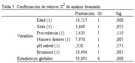 El diagnóstico del modelo de regresión se realizó por medio de la codificación de las variables de estudio, estableciéndose un valor de cero para la presencia de la condición de riesgo (categoría de estudio) y un valor de uno para la ausencia de esta (categoría de referencia) (Tabla 4). Se comprobó que los valores de X2 y el valor p del análisis bivariado individual coincidieran con los obtenidos en el análisis de las variables en ecuación, con esto se aseguró que la codificación de las variables de estudio es correcta (Tabla 5).