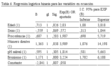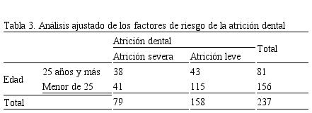 Luego del diagnóstico se realizó la regresión logística binaria para determinar el riesgo de los factores en conjunto. Se puede observar que los factores de riesgo ajustados y relacionados con la atrición dental severa fueron la edad (OR= 2,03; IC 95%= 1,08 – 3,818; p= 0,026), el número de dientes residuales 20 o menos (OR= 3,909; IC 95%= 1,07 – 14,198; p= 0,038) y el bruxismo (OR= 3,224; IC 95%= 1,702 – 6,108; p= 0,000); (Tabla 4), confirmando la relación estadística obtenida en el análisis bivariado.