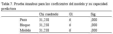 Finalmente, se estableció la capacidad predictora de las variables mediante la prueba ómnibus para los coeficientes del modelo, según la significancia de las variables en bloque (v= 0,000) estas son adecuadas para predecir la presencia de atrición dental severa en individuos expuestos (Tabla 7).
