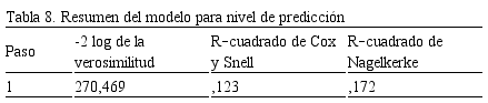 Sin embargo, al analizar los valores del R–cuadrado de Cox y Snell y el R–cuadrado de Nagelkerke, se observa una capacidad predictora muy baja de los factores en estudio (Tabla 8).
