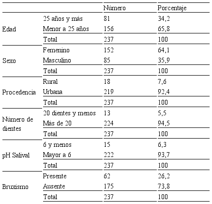 Entre los pacientes incluidos en los dos grupos predominaron los menores de 25 años, de sexo femenino, procedencia urbana, con más de 20 piezas dentarias en boca, pH salival mayor a 6 y bruxismo ausente (Tabla 2).