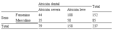 Es interesante destacar que los resultados del presente estudio no lograron evidenciar una relación estadísticamente significativa entre el sexo de los participantes y la atrición dental severa, coincidiendo con autores como Bernhartd (15), quien en el año 2006 observó los indicadores de riesgo en la etiología de la atrición dental en 2.707 sujetos en la localidad de Pomerania (Alemania), concluyendo que no existe asociación evidente entre el sexo masculino y la atrición severa (OR = 1,08 IC=0,84-1,21). Del mismo modo, Rafeek et al (16) realizaron un estudio descriptivo en el West Indies Polyclinic, Mount Hope en Trinidad, analizando 155 pacientes, concluyendo que el sexo de los participantes incluidos en el estudio no se relacionó en forma positiva con la atrición dental (OR= 0,46 IC= 0,18 – 1,17). Por lo tanto, estos estudios descartan el sexo como un factor de riesgo para la aparición de atrición dental severa. Sin embargo, otros estudios han demostrado que existe mayor predisposición de sufrir atrición dental severa en hombres en comparación con las mujeres. Es el caso de autores como Hugoson (17), Smith (14), Nunn (18), Wetselaar (19), quienes han encontrado una relación estadísticamente significativa entre el sexo masculino y la atrición dental severa (p= 0,001). Esta relación estaría soportada por el argumento que indica que el sexo masculino tiene mayor fuerza muscular durante el apretamiento dental en comparación con el sexo femenino y que al existir esta diferencia, las estructuras dentarias de los hombres soportarían más carga durante el acto de apretar propio del bruxismo. Por lo pronto, nuestro estudio no ha podido evidenciar una diferencia significativa en cuanto a la presencia de atrición dental y el hecho de pertenecer al sexo masculino o femenino.