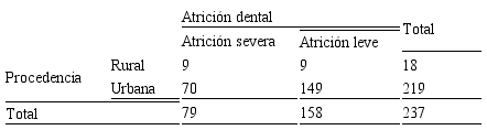 Autores como Mckee et al(20) defienden la hipótesis de que la atrición dental se produce en mayor porcentaje y severidad en personas de procedencia rural, esto se debería al tipo de alimentos consumidos y la cocción de estos, que podrían ser más sólidos y abrasivos que aquellos que ingieren las personas de procedencia urbana. Para justificar dicha afirmación los autores realizaron un estudio comparando las alturas cuspídeas en modelos de yeso tomados de niños y jóvenes aborígenes australianos que vivían en comunidades rurales (64 individuos, 28 hombres y 36 mujeres), y modelos obtenidos de niños y jóvenes de procedencia urbana. Los promedios y grados de atrición dental fueron mucho mayores en los modelos de los niños aborígenes en comparación con los de los niños y jóvenes europeos de procedencia urbana. Esta diferencia, según los autores, sería atribuida a la cantidad de partículas abrasivas en los alimentos de cada grupo. Astrom (21), defiende la teoría de Mckee y Molnar indicando que, además del tipo de alimentación, influye la menor cantidad de enfermedades cariosas y periodontales que atacan a las personas de procedencia rural, debido a la menor ingesta de productos procesados y azucarados, y a la marcada diferencia en el desarrollo de conductas de cuidado dental en este grupo. Esto podría facilitar el desarrollo de otro tipo de condiciones propias de la mayor permanencia en boca de las piezas dentarias, probablemente por un mayor uso de la dentición según el avance de la edad, agravando la atrición dental fisiológica. Todos los estudios mencionados concluyen que la atrición dental podría estar asociada en mayor medida con la procedencia rural. Sin embargo, en el presente estudio no se pudo evidenciar dicha asociación.