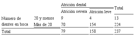 El número reducido de dientes residuales (< a 20) también ha sido relacionado con la presencia de atrición dental severa, ya que mientras menos dientes presente una persona, mayor sobrecarga funcional o parafuncional recibirán las mismas (6); este proceso de atrición dental acelerada estaría relacionado con la necesidad de reemplazo funcional, que la ausencia de un grupo de piezas dentarias provocaría, dado que se pondría en marcha un proceso de compensación por parte de las piezas residuales, siempre a costa de su integridad estructural macro y micro morfológica.