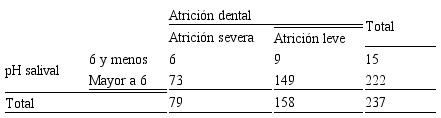 Locke et al (22) han concluido recientemente que los pacientes con registros de flujo salival no estimulado con valores inferiores a 0,1mL/minuto tienen cinco veces más riesgo de presentar algún tipo de desgaste dental, lo cual se debe a un pH muy bajo de la cavidad bucal. Apoyando esta hipótesis están West et al (23) quienes realizaron un estudio in vitro en el que se demuestra que un pH bajo (menor a 6) en la cavidad bucal aumenta la rapidez y severidad del desgaste dental, indicando incluso una posibilidad de diez veces más erosión de esmalte en condiciones ácidas, demostrándose de esta manera, no solo el efecto devastador del pH ácido sobre el tejido mineralizado, sino además el efecto remineralizador que ejerce la saliva. Estos datos demuestran una fuerte asociación entre el pH ácido y la posibilidad de desarrollar atrición dental severa, sin embargo, en el presente estudio no se pudo evidenciar dicha asociación, probablemente por el escaso número de pacientes con pH salival menor a 6. Es por este motivo que se recomienda realizar estudios con un número mayor de participantes y que se enfoquen, de manera más específica, en las condiciones ácidas de la cavidad bucal para establecer una posible relación entre estos dos factores.