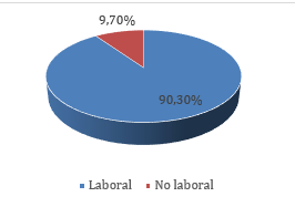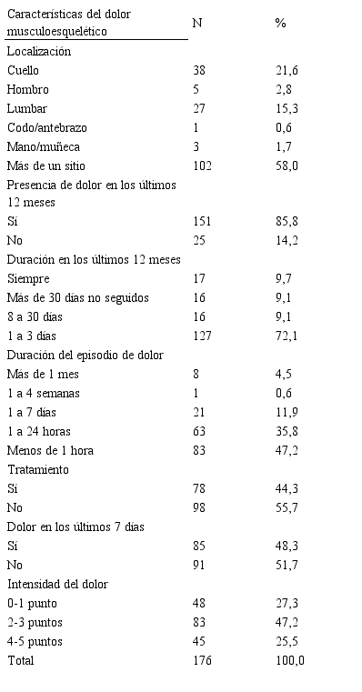 El 58% reportó tener dolor en más de un sitio de afección, un 21,6% refirió solo cervicalgia y 15,3% solo lumbalgia. El 56,8% tuvo dolor por un año o más. El 85,8% ha tenido el dolor en los últimos doce meses. Al 72,1% el dolor durante los últimos 12 meses le ha durado de uno a tres días. La duración del episodio de dolor fue de menos de una hora en un 47,2%. Al 85,2%, el tiempo en que el dolor impidió el trabajo fue de menos de un día. El 44,3% refirió haber recibido tratamiento para el dolor en los últimos doce meses. El 48,3% refirió tener molestias en los últimos siete días. De acuerdo a la escala visual analógica, el 47,2% manifestó un grado de molestia del dolor entre dos a tres puntos en base a una escala de cinco puntos (Tabla 2). El 90,3% considera que el dolor musculoesquelético que presenta es de origen laboral (Gráfico 2).