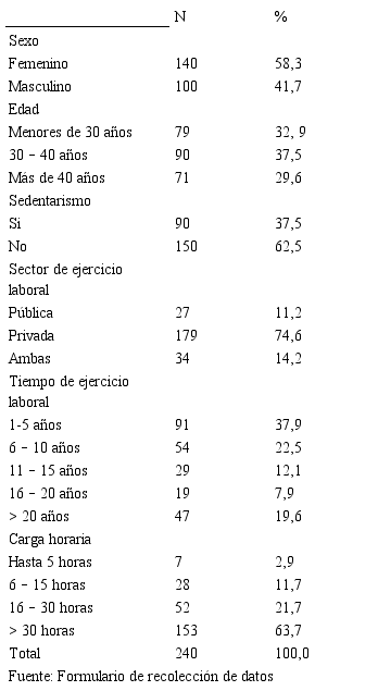 El 58,3% de los participantes correspondió al sexo femenino y 41,7% al masculino. El promedio de edad fue de 37 años con un DE de 11,6. La mayoría de los participantes realizaba actividad física (62,5%). El 13,8% ejercía otra actividad laboral. La mayoría tenía ejercicio privado (74,6%). El 37,9% tuvo una práctica profesional de 1 a 5 años; luego el 22,5%, de 6 a 10 años y el 19,6% con más de 20 años. El 63,8% presentó una carga horaria mayor a 30 horas por semana (Tabla 1). La prevalencia de dolor musculoesquelético fue del 73,3% (Gráfico 1).