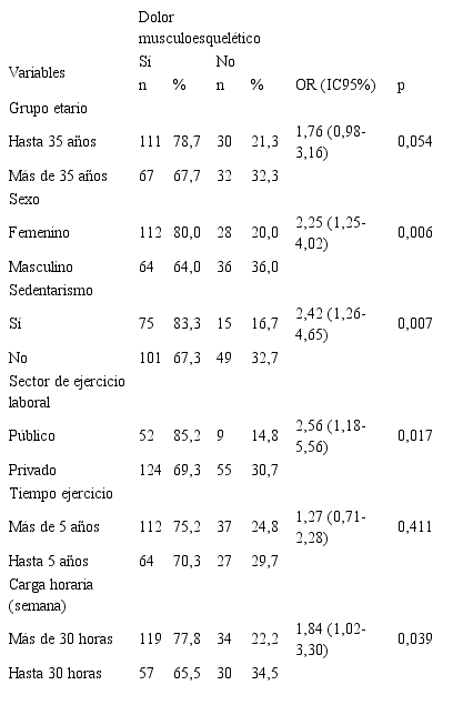 Se aplicó la prueba de Chi cuadrado de Pearson para la evaluación de asociación entre dos variables cuantitativas. Se utilizó el Odds Ratio (OR) con un intervalo de confianza del 95% para estimar la probabilidad de presencia de la enfermedad y determinar asociación del dolor musculoesquelético con edad, sexo, actividad física, tipo de actividad (pública o privada), tiempo de ejercicio de la profesión y carga horaria semanal. Los resultados de las pruebas estadísticas se consideraron como estadísticamente significativos cuando se obtuvo un valor de p menor a 0,05.