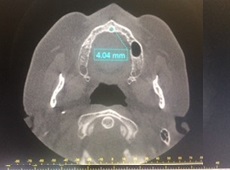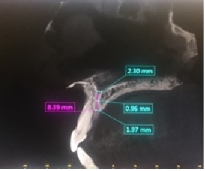 La primera medida perpendicular se obtuvo en el corte sagital oblicuo a nivel inferior del CNP situado desde la cortical interna hasta la cortical externa de su pared anterior. La segunda medida se obtuvo a nivel medio del mencionado conducto, equidistante entre la porción superior e inferior, situado desde la cortical interna y externa. La tercera medida se obtuvo a nivel superior de la pared anterior del CNP, a nivel del piso de fosas nasales y de cortical interna a cortical externa. La medida vertical se realizó desde la medida superior a la inferior horizontal en el centro de la luz del conducto (ver imagen 1 y 3). La medida transversal se obtuvo en un corte axial a nivel de un punto equidistante entre superior e inferior (ver imagen 2 y 4).