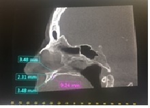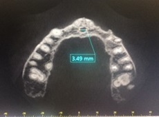 Las imágenes se realizaron en el tomógrafo digital 3D Accuitomo 170 marca MORITA, con una ventana de trabajo de 50mm x 150mm y un tamaño de vóxel de 80µm. Los valores aplicados al equipo fueron de 90kV y 6mA con un tiempo de exposición aproximado de doce a quince segundos dependiendo de la contextura física, presencia de piezas dentarias y tipo de maxilar. En la estación de trabajo se editaron las imágenes tomográficas a través del software i-Dixel del equipo 3D Accuitomo 170 MORITA, sistema DICOM, por medio del monitor del panel LCD de 30” de tecnología IPS de alto brillo para el detalle más fino de los contraste con tecnología “Spot View”. Se realizó el diagnóstico a través de luz indirecta y ambiente tranquilo. En estas condiciones se obtuvieron los diferentes cortes tomográficos, seleccionando el corte Sagital (para axial) generado a partir del mismo el corte oblicuo. Sobre este corte oblicuo tomográfico se generaron tres medidas perpendiculares a las estructuras anatómicas.
