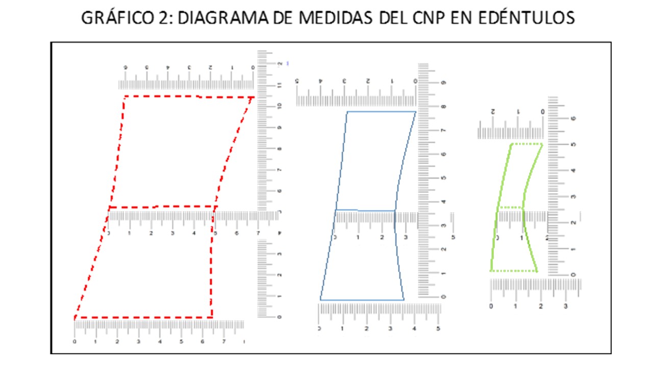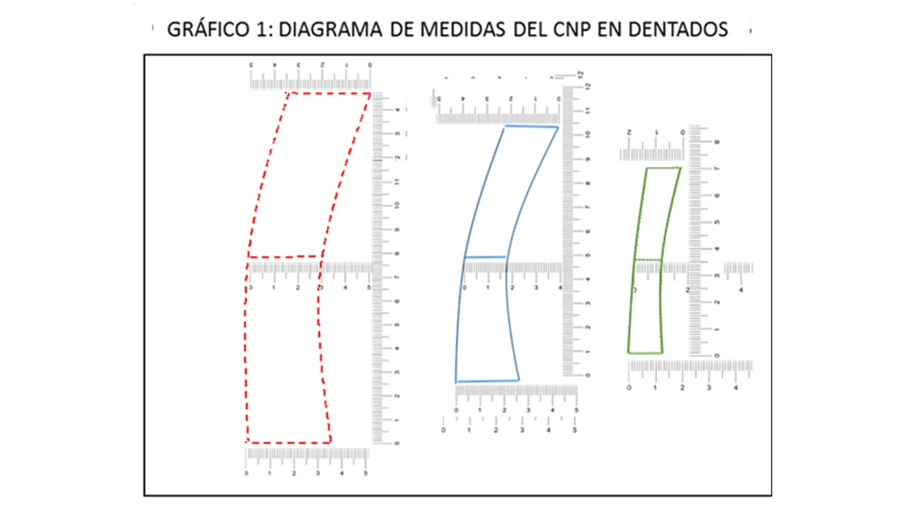 Los resultados de este estudio demuestran la variabilidad en el ancho y la longitud del CNP en pacientes dentados y desdentados en el sector anterosuperior. Se observa de manera preponderante en los cortes sagitales una forma como de reloj de arena, techo, base amplia y estrechamiento en la mitad del trayecto orientado hacia delante. En el estudio realizado por Gönül se encontraron variables con corte axial en formas de corazón, triangular, oval separado, oval no separado (2). Las formas otorgadas por Bornstein en el corte coronal son canal único, dos canales paralelos y canal en forma de Y (13). En el corte sagital, Mardinger clasificó en cilíndrico (50.7%), embudo (30.9%), reloj de arena (14.5%), forma de banana (3.9%), similar a lo convertido en los gráficos presentados en nuestro estudio (5).